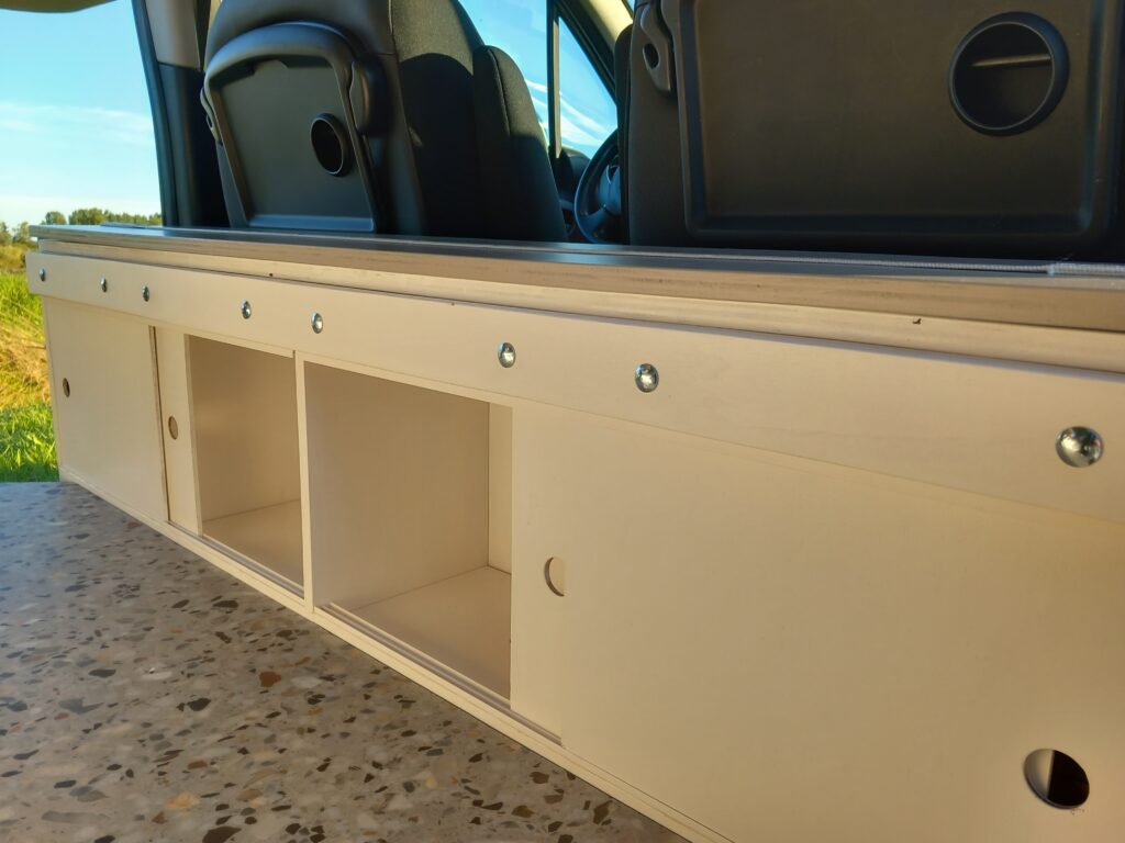 Na het installeren heb je een camper met zit, bed, keuken en bagageruimte.